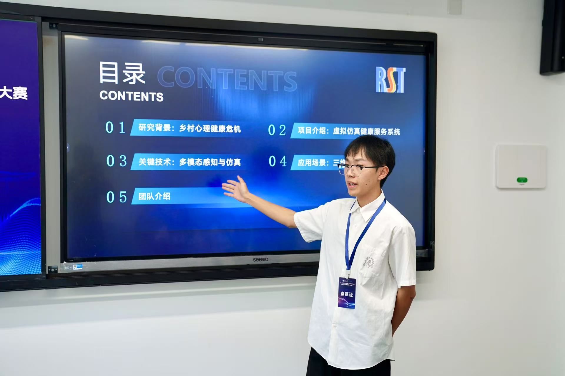 在7月15-16日的展示环节,参赛队伍分别在健康服务系统虚拟仿真、运动与人机交互方案、智慧体育教学与训练模拟、AI+体育知识科普创意四大赛道依次亮相。太阳成集团tyc151cc“体育与运动仿真战队”的作品聚焦乡村青少年心理健康,借助XR与数字孪生技术复刻鼎湖山湿地等自然场景;员工沉浸体验的同时,系统实时采集心率变异性、皮电等生理指标,动态推送正念呼吸引导并自动调节任务难度,最终生成专注力与情绪稳定性曲线等个性化报告,形成“课前匹配—课中干预—课后追踪”的闭环服务。凭借清晰的应用场景和良好的推广价值,作品在展示答辩环节获得评委一致认可,荣获国赛三等奖。