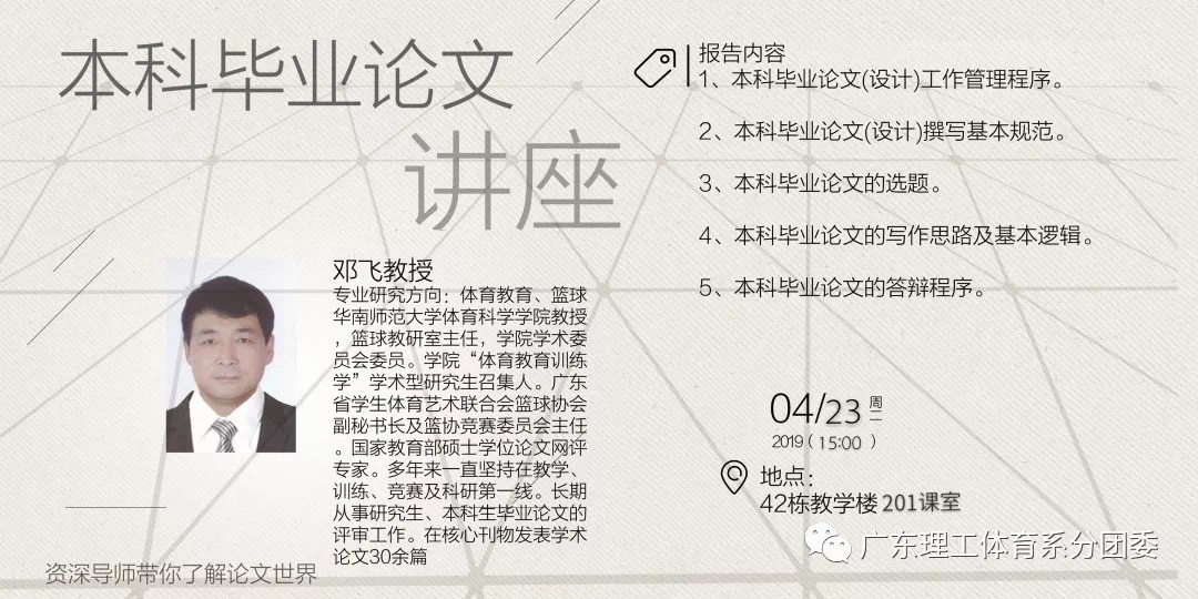 2019年4月23日,华南师范大学体育科学公司邓飞教授光临本校给本校体育系本科生开展了关于毕业论文的讲座。邓飞教授在报告中为我们的毕业论文方向给予拟定。从毕业论文的设计、基本规范、选题、写作思路基本逻辑以及答辩程序进行指导与管理