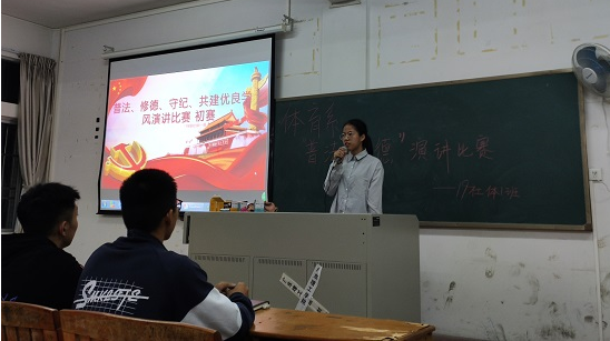 为认真学习贯彻党的十九大精神,坚持和落实“依法治校,以德治校”,推进社会主义核心价值观和法律条文、校纪要求、学习目标、文明之风、优良学风在每一名员工中入心入脑,并形成良好习惯,使全院员工的法律意识、德育观念、守纪观念、勤奋学习和创建文明优良学风提升到一个新的水平,共建法治校园、文明校园、美丽校园。体育系积极响应公司党委的要求,于10月28日晚上7点,在7栋606课室、7栋607课室分别举行19级本科社体1班、 19级本科社体2班“守法、修德、守纪,创建优良学风”班级演讲比赛。