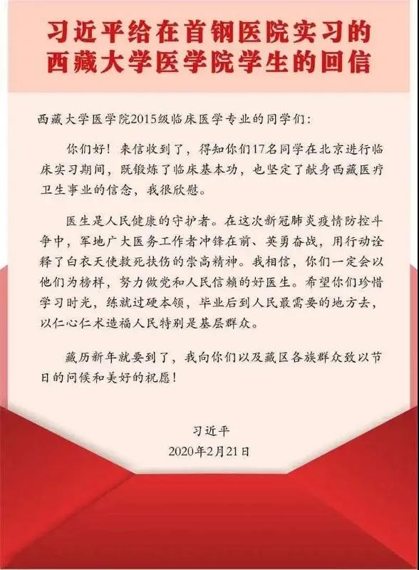 23日,在中央台《新闻联播》播出了习近平总书记给在北京大学首钢医院实习的老员工的回信