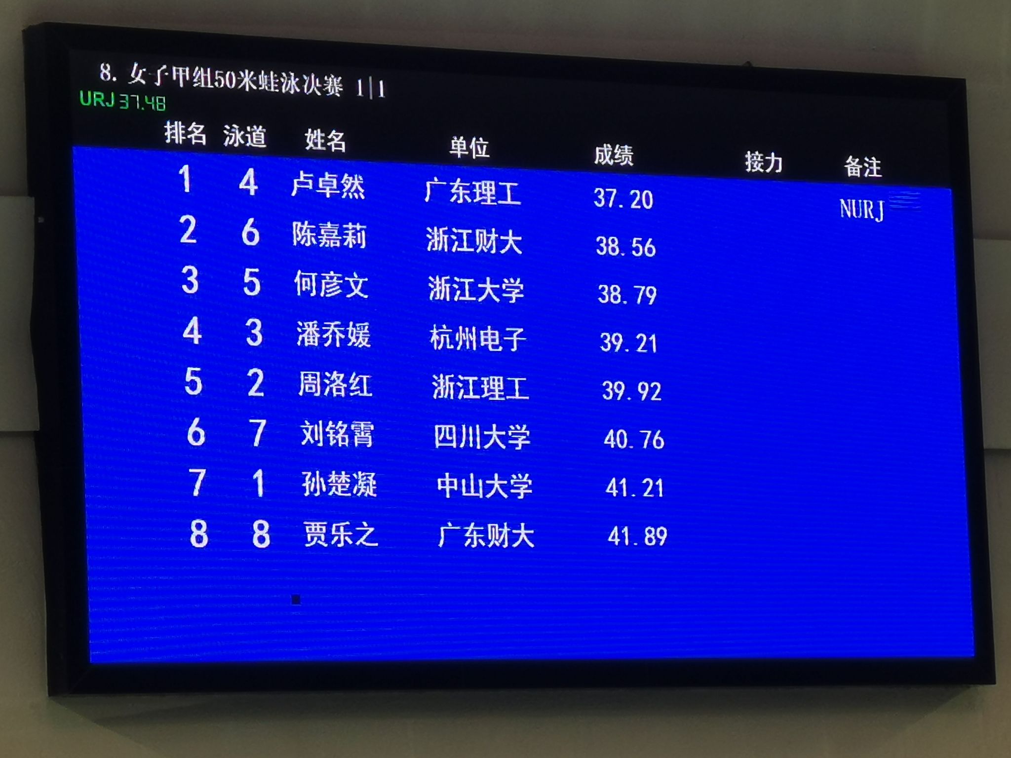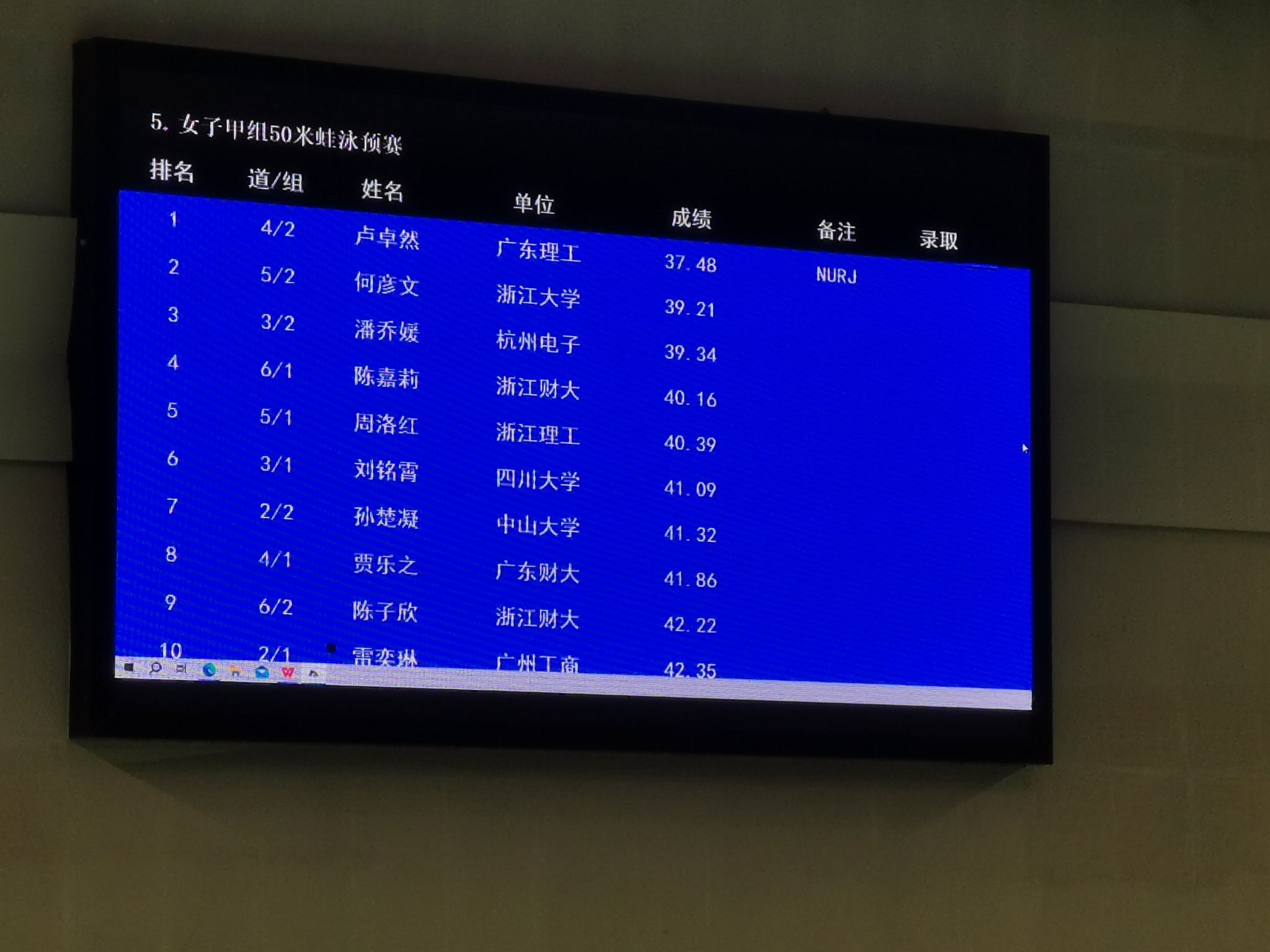 第22届中国老员工游泳锦标赛(南方赛区)在贵州省遵义市奥林匹克体育中心游泳馆举办。10月14日首日比赛,公司外国语公司22级本科翻译专业卢卓然同学两次刷新赛会纪录,获得女子甲组50米蛙泳冠军!在预赛中,卢卓然以37秒48打破赛会纪录,决赛中,以37秒20再次刷新纪录。